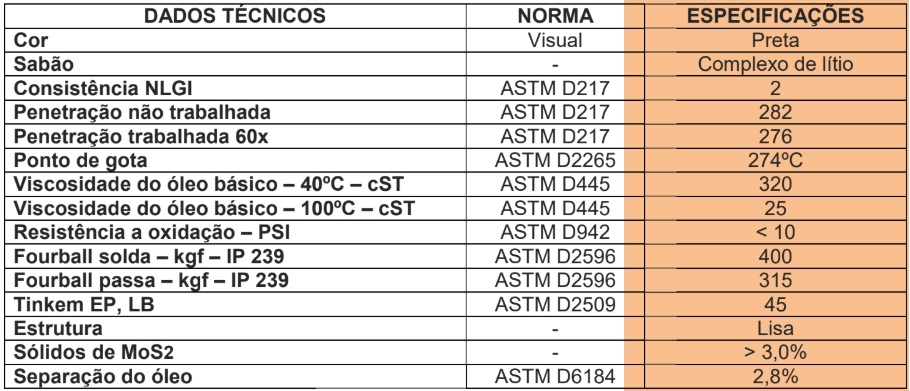 Graxa lubrificante de uso industrial a base de sabão de complexo de lítio, contendo em sua formulação MoS2, óleo semi sintético, aditivos de extrema pressão, antioxidantes e anticorrosivos. Possui elevado ponto de gota.