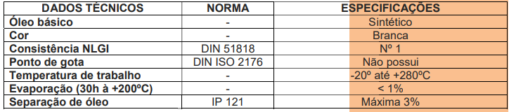 Graxa sintética, isenta de silicone. Produto com tecnologia avançada, para lubrificação em elevadas temperaturas, com prolongados períodos entre aplicações. Não deixa resíduos abrasivos e não é atacada pelos vapores oriundos dos banhos de tratamento térmico de superfície, podendo ser utilizada em locais sujeitos a temperaturas constantemente altas, ou ainda nos locais sujeitos a grandes variações de temperaturas, sem problemas de partida a frio.